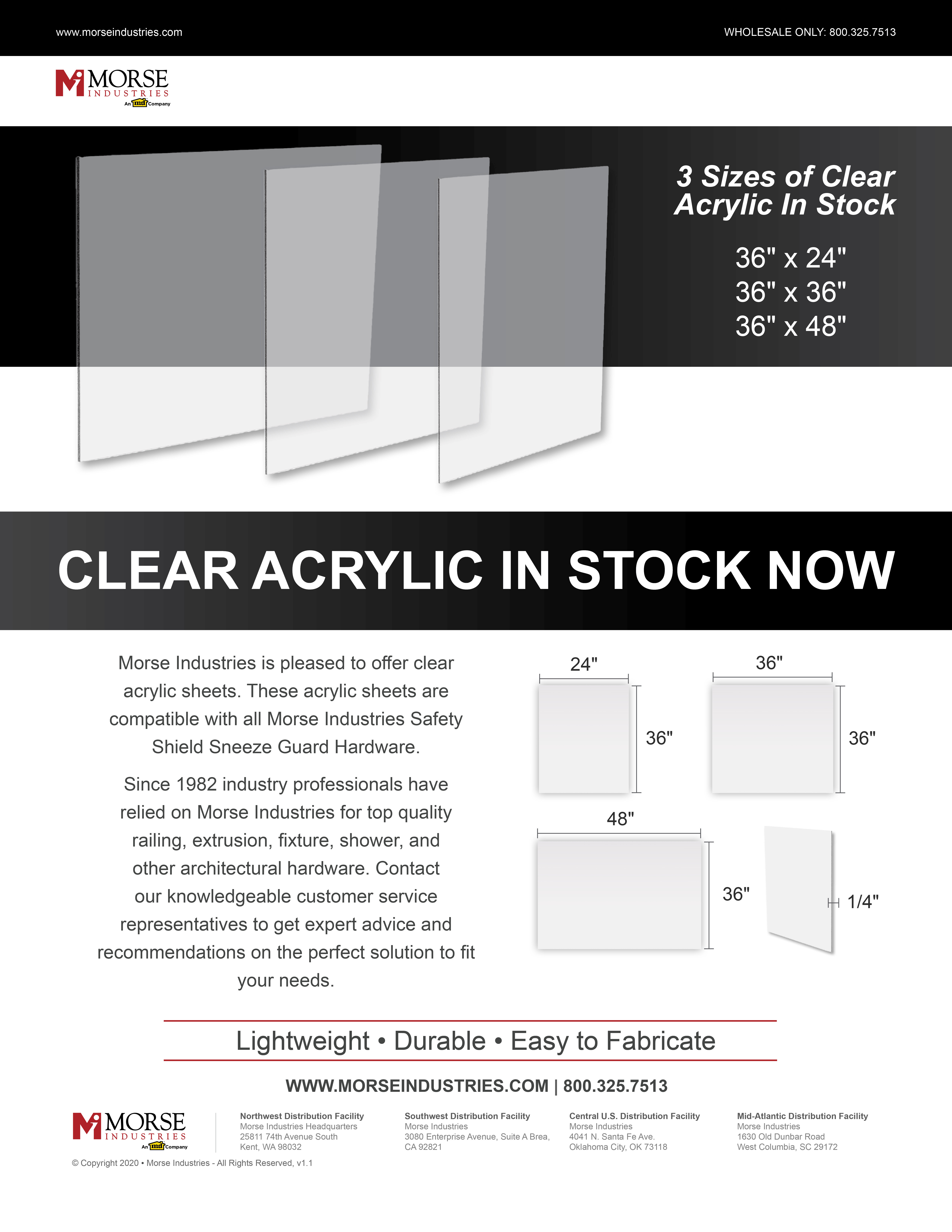 Morse Industries is pleased to offer clear acrylic sheets. These acrylic sheets are compatible with all Morse Industries Safety Shield Sneeze Guard Hardware.