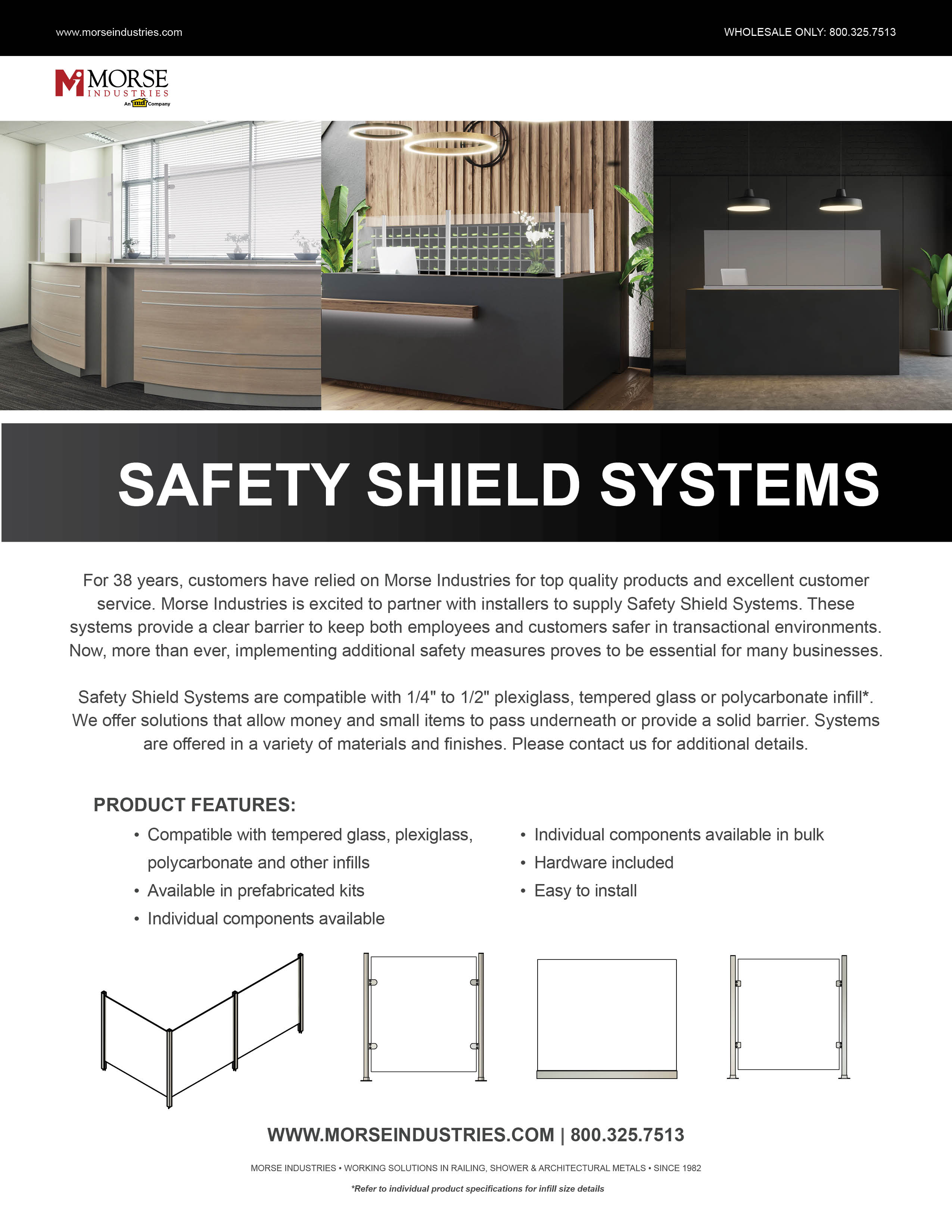 Morse Industries is excited to partner with installers to supply Safety Shield Systems. The sneeze guard style systems provide a clear barrier to keep both employees and customers safer in transactional environments. Now, more than ever, implementing additional safety measures proves to be essential for many businesses. Safety Shield Systems are compatible with 1/4" to 1/2" plexiglass, tempered glass or polycarbonate infill. We offer solutions that allow money and small items to pass underneath or provide a solid barrier. Systems are offered in a variety of materials and finishes. Please contact us for additional details.